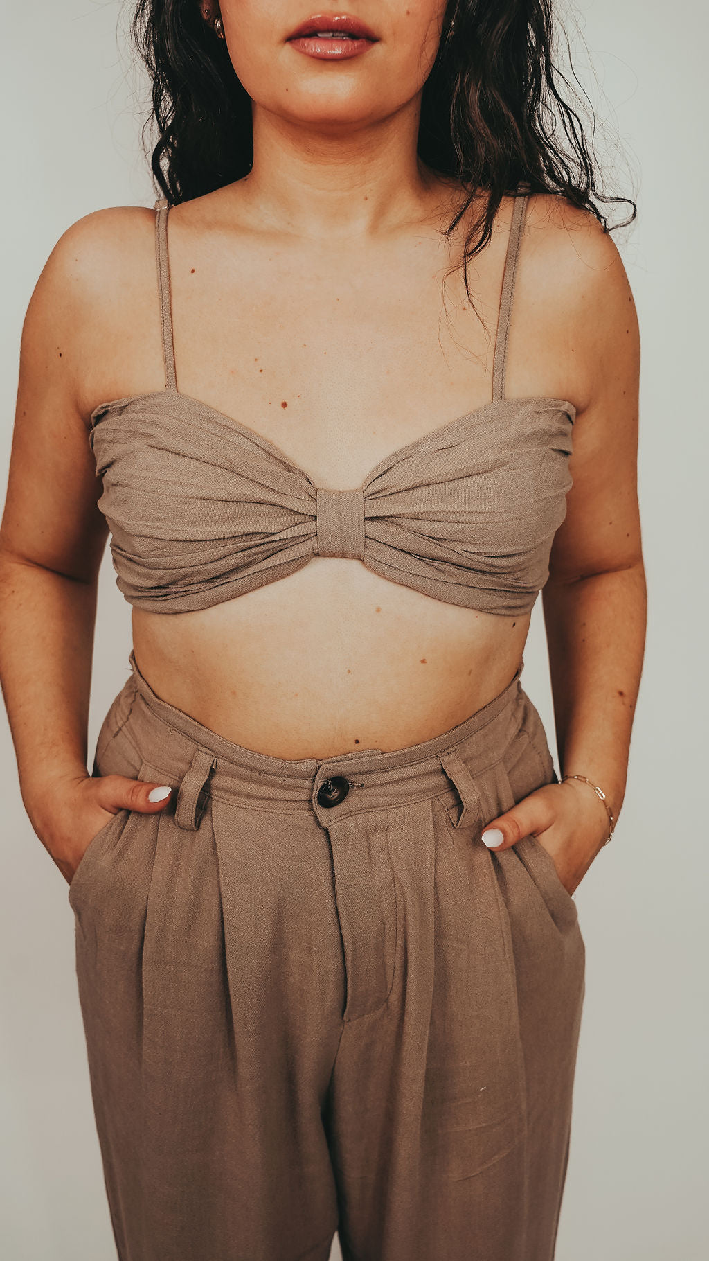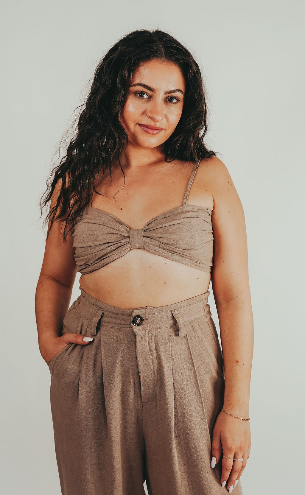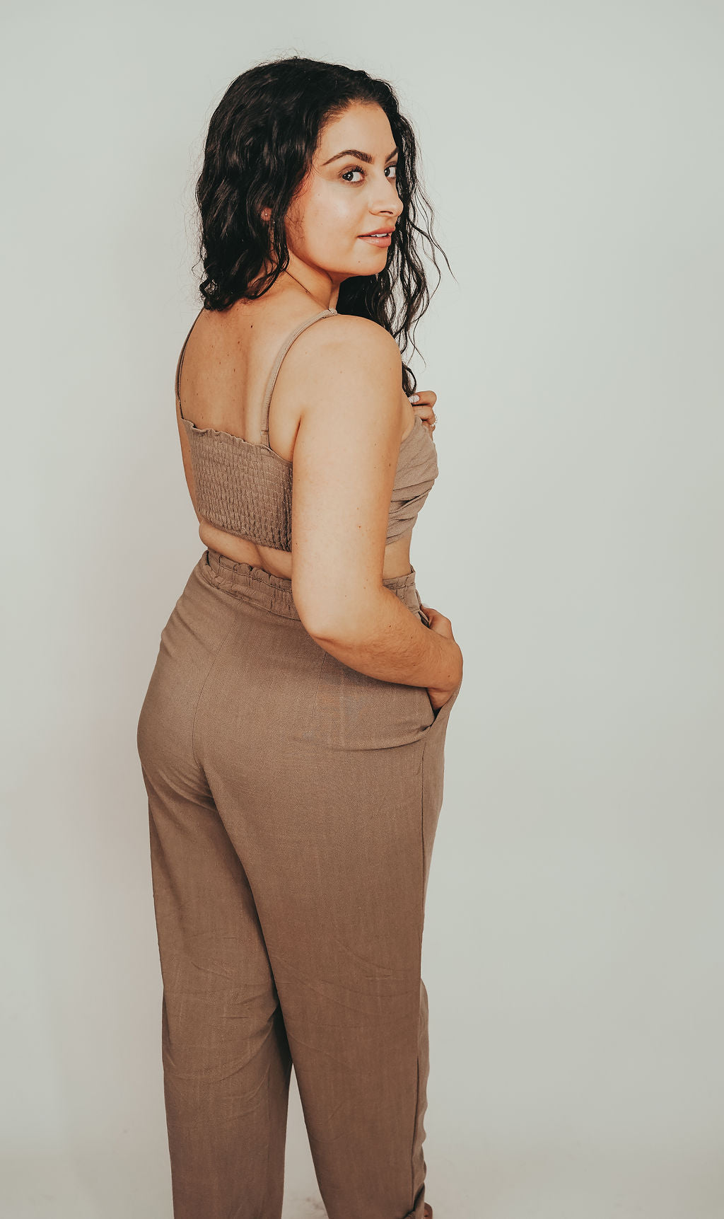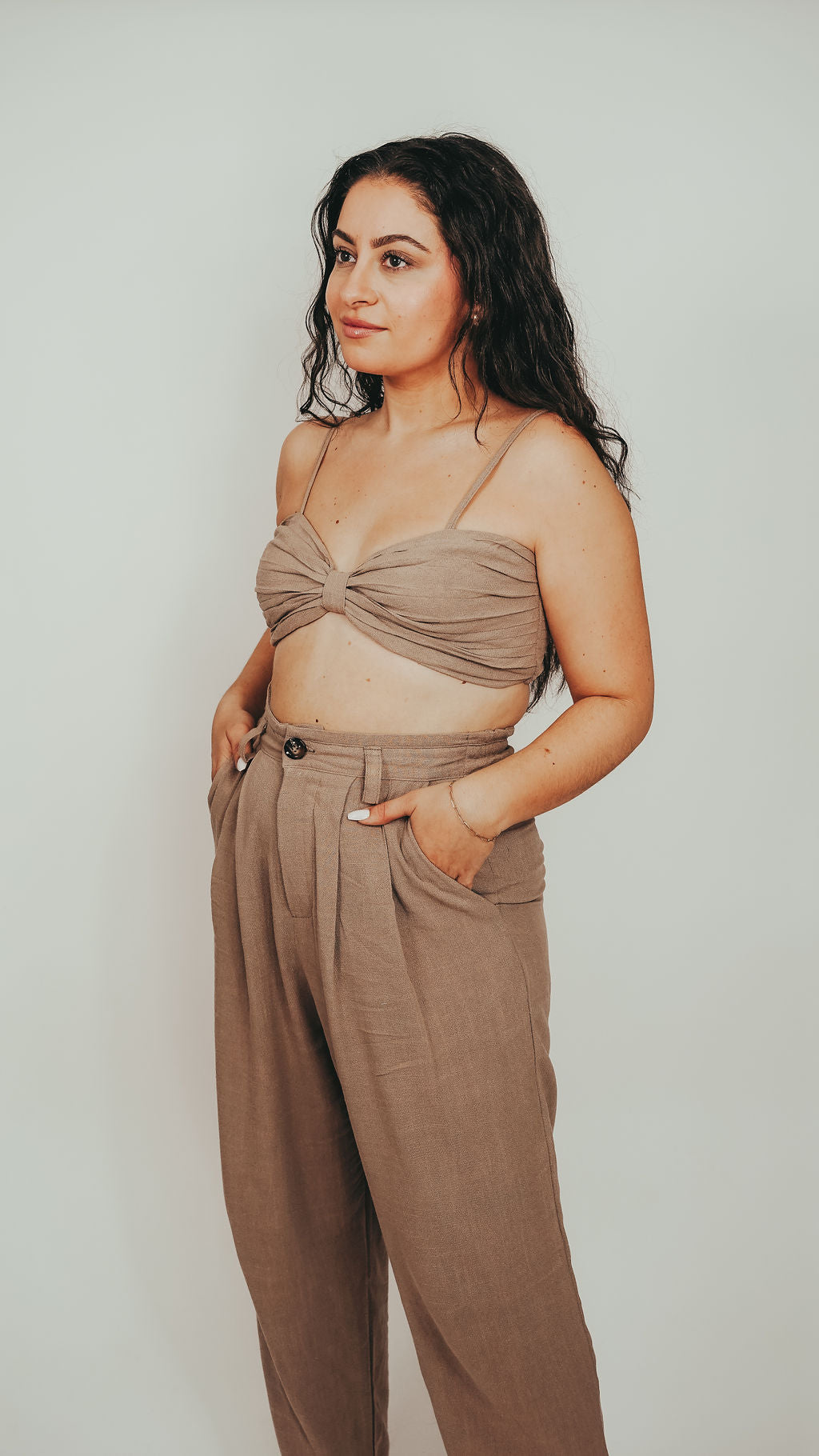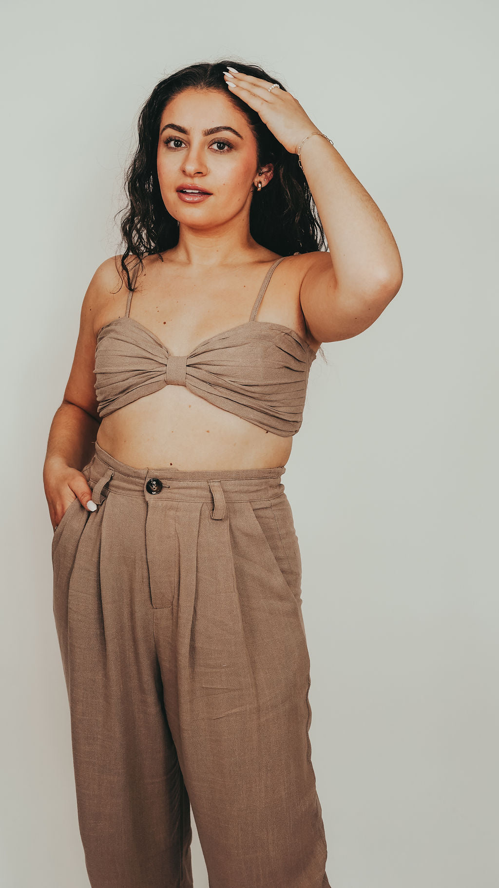 Shop the Abigail Cropped Set for a trendy and stylish look. This matching set includes a crop top and pants in neutral tones. Perfect for any occasion, this set is designed for women who love fashion-forward outfits. Elevate your wardrobe with this must-have set today!
