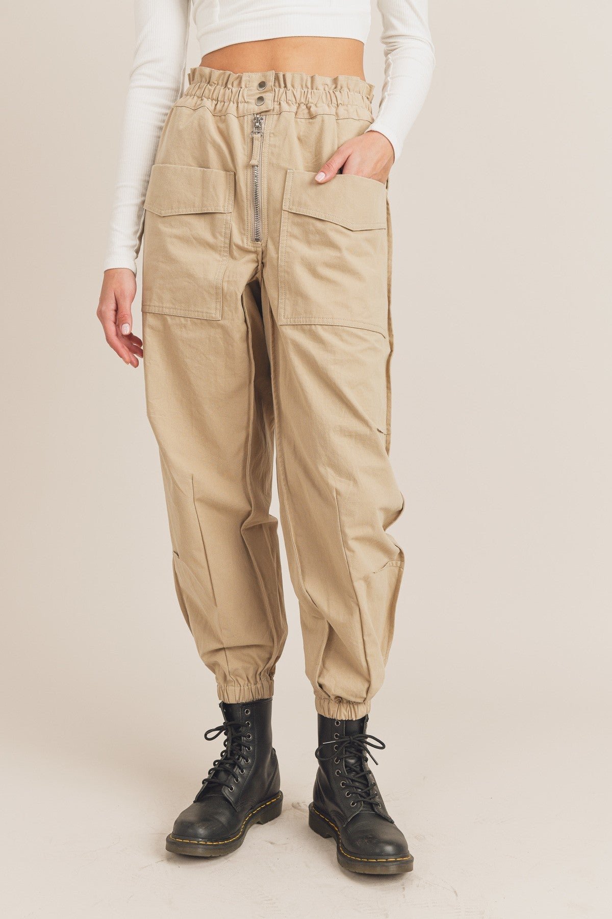 Shop the Aggie Cargo Pants for women. These jogger-style cargo pants feature an elastic waistband, front and back pockets, and a front exposed zipper. Perfect for fall, these neutral-colored pants are a stylish addition to your wardrobe.