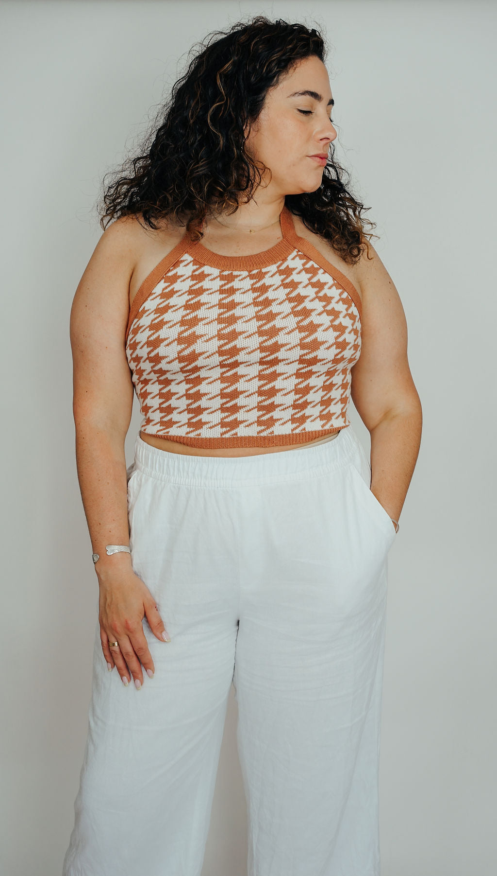 Shop the Ailani Houndstooth Halter Knit Top for a trendy and versatile addition to your wardrobe. This crop top features a houndstooth pattern and a halter neckline, perfect for pairing with high-waisted bottoms. Available in neutral tones, this top is a must-have for any fashion-forward woman.