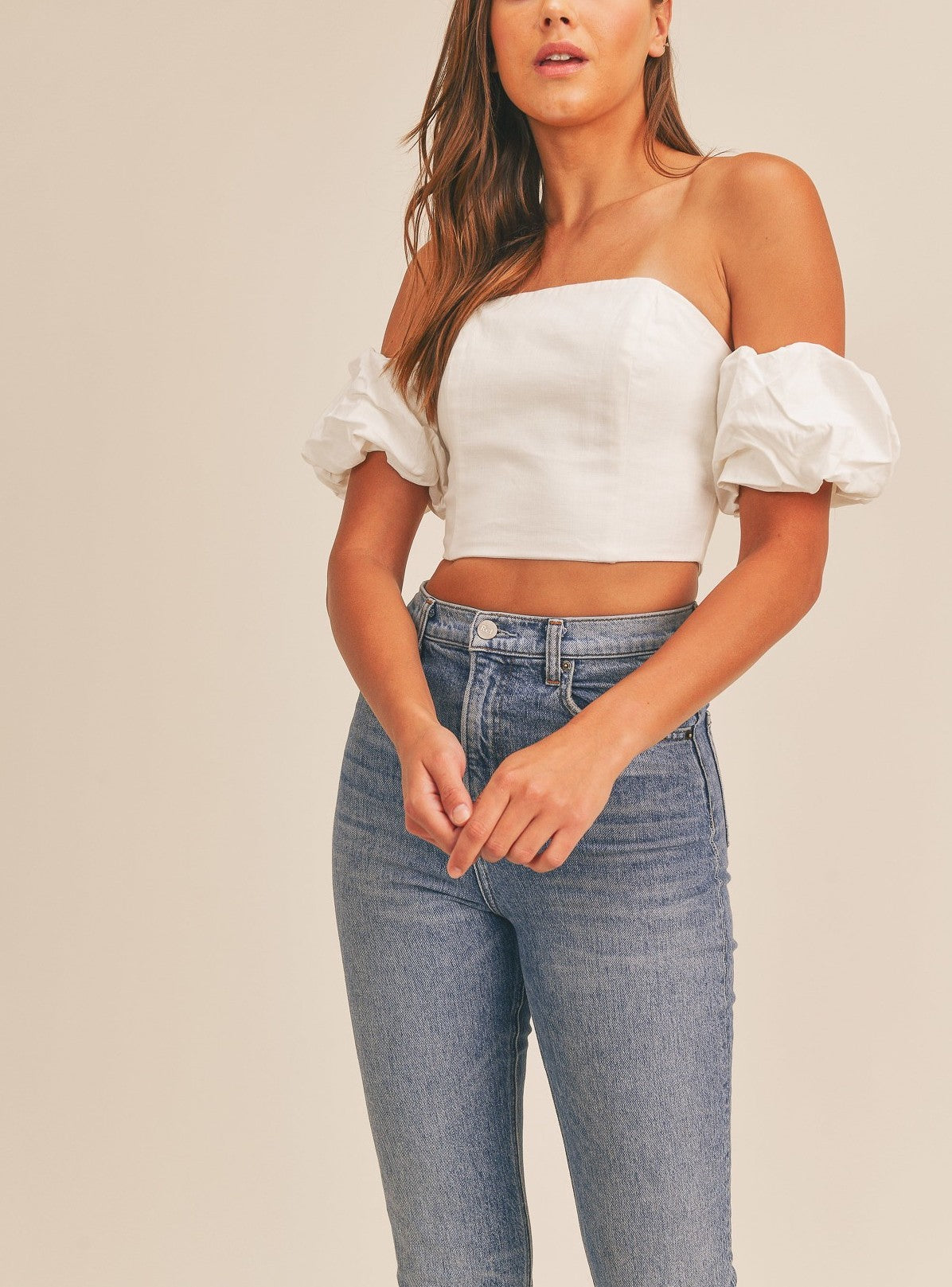 Short sleeve off shoulder cropped top with back lace up detailing.