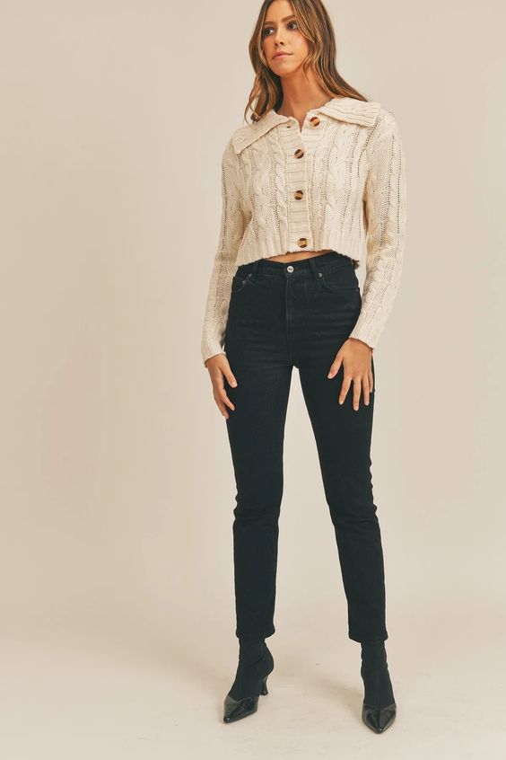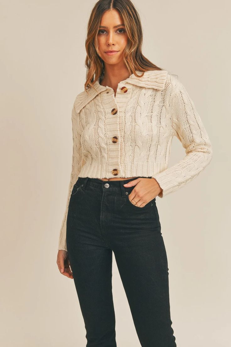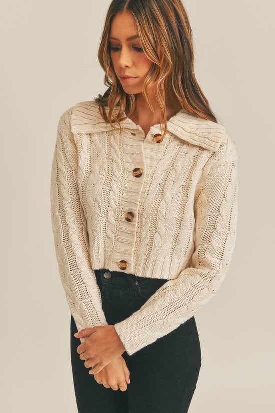 Cable Knit Cropped Cardigan, Long Collar Cardigan, Button Down Knit Top, Cropped Cable Sweater, Women's Knit Cardigan, Long Collar Knitwear, Cropped Button Sweater, Classic Cable Knit, Cozy Cropped Cardigan, Chunky Knit Cardigan, Preppy Knit Top