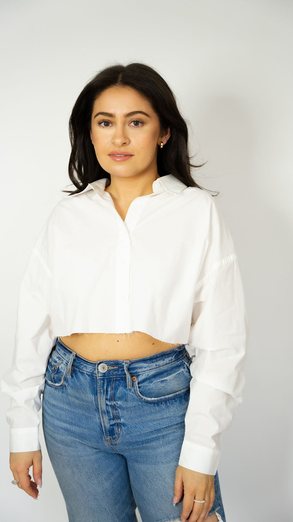 The modern take on a classic. The Candace button up features a cropped raw edge design, giving that tailored look with a little edge.