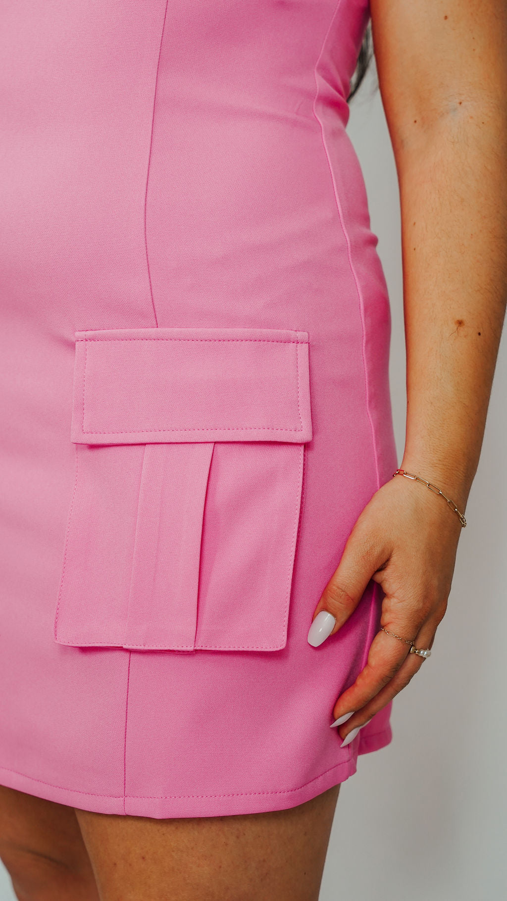 Barbie who? Stun in this pink mini dress, featuring a belt detail along the bust and cargo pockets.