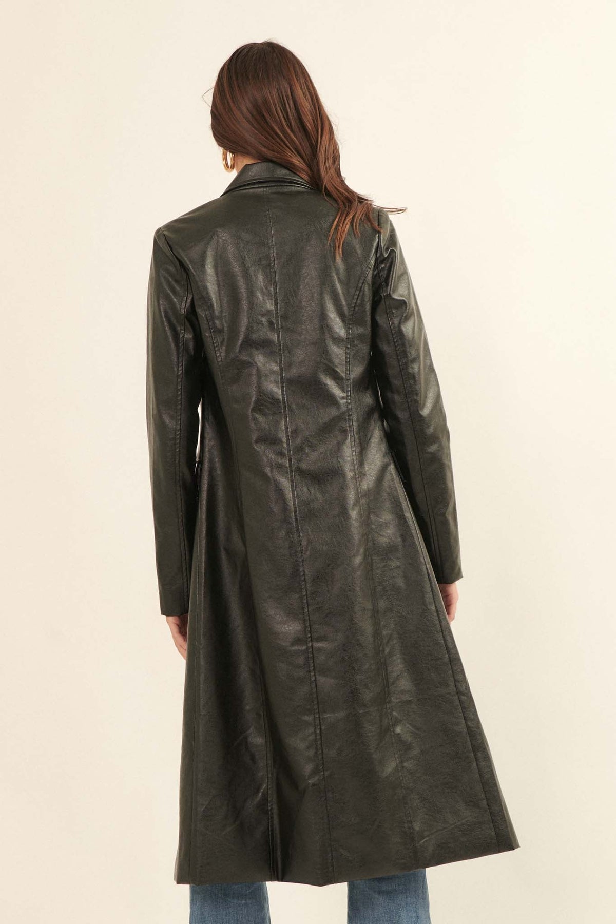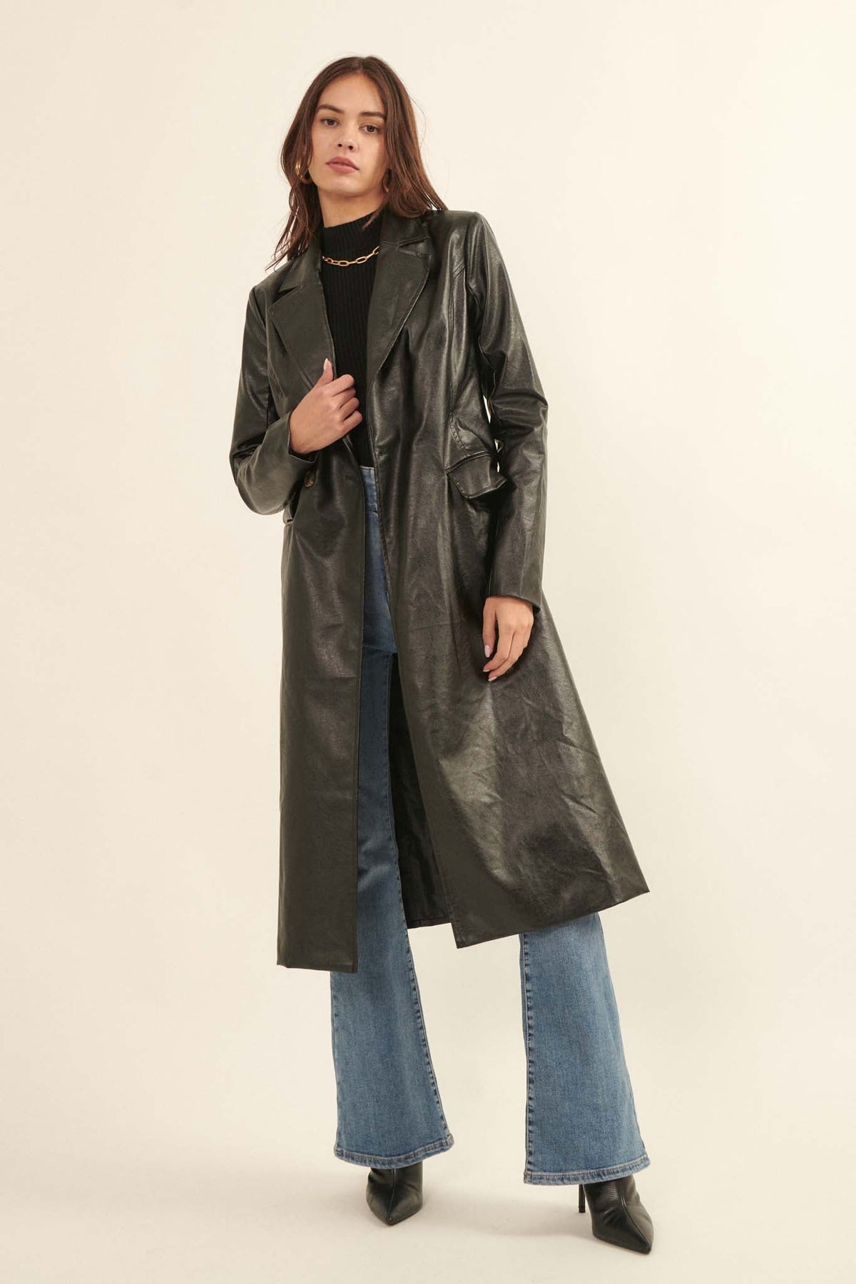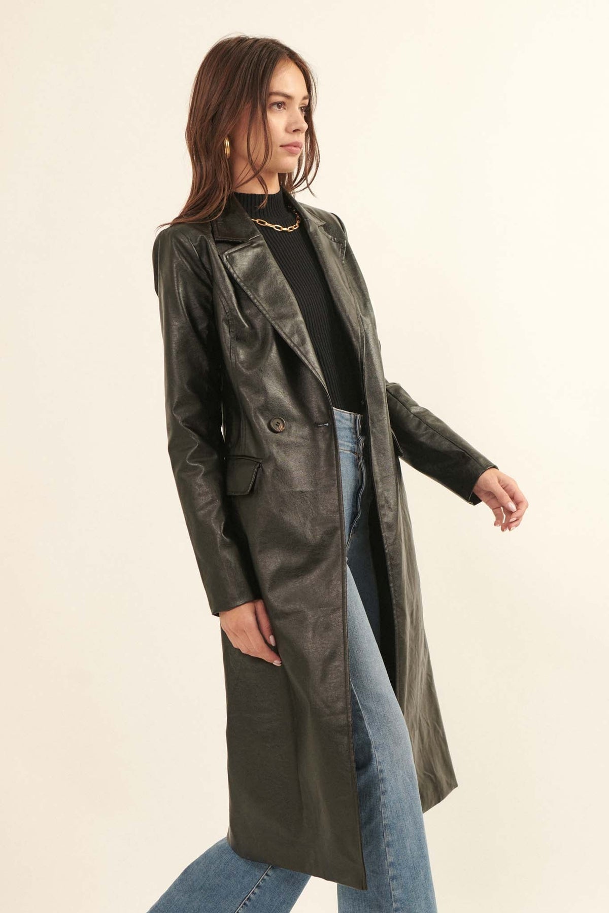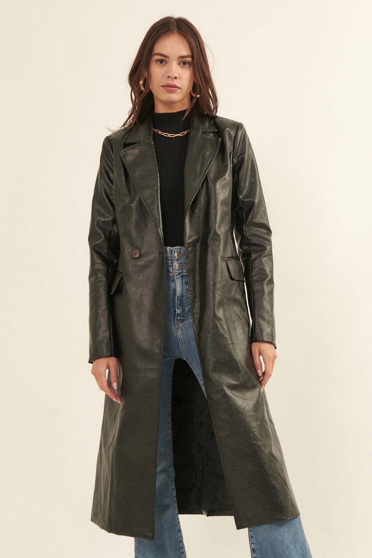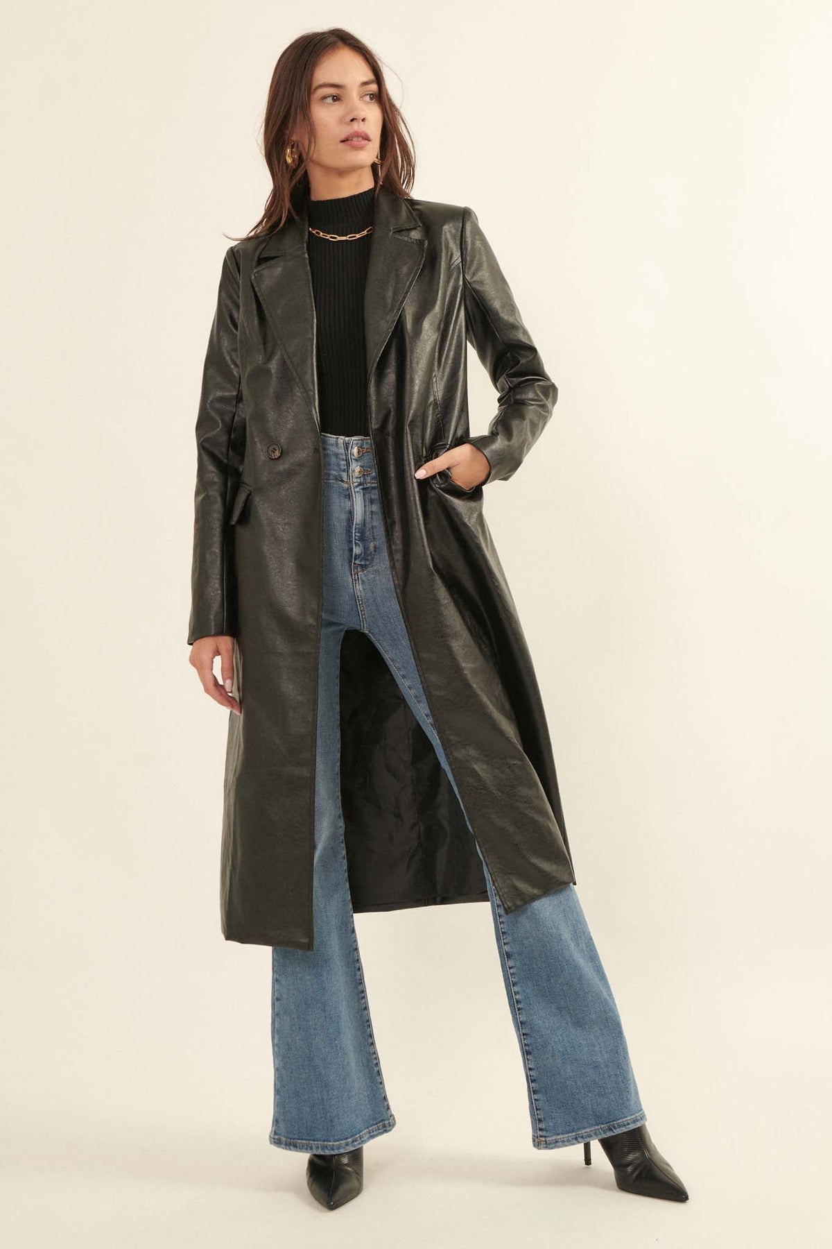 Stay stylish this fall with our Della Vegan Leather Trench Coat. Featuring an oversized notch lapel collar and a one-button double-breasted closure, this faux leather jacket is both trendy and cruelty-free. Complete your look with this must-have fall jacket.
