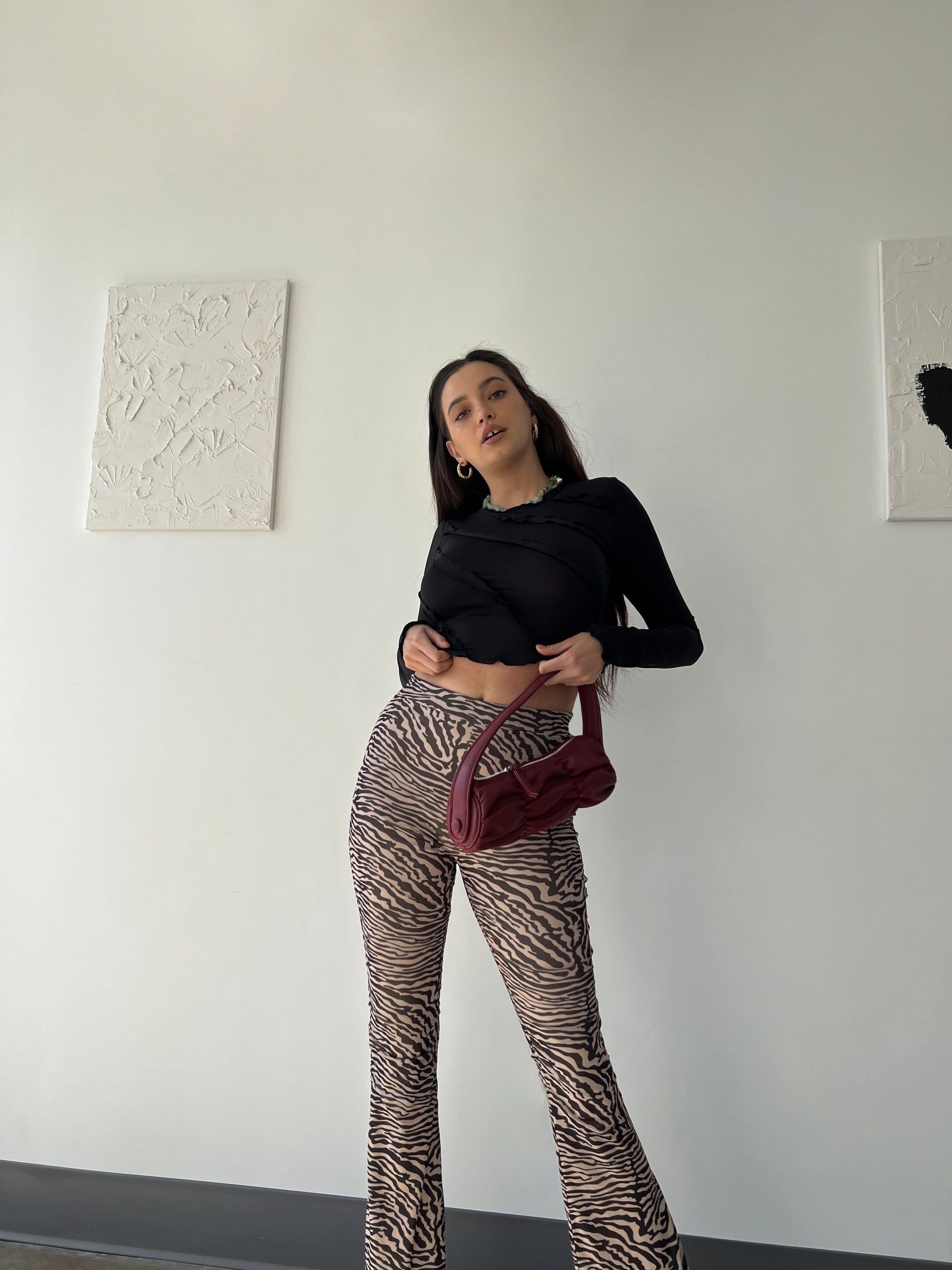 Elevate your style with Erin Mesh Zebra Pants. Perfect for the fall season, these trendy mesh pants feature a bold zebra print for a chic look.