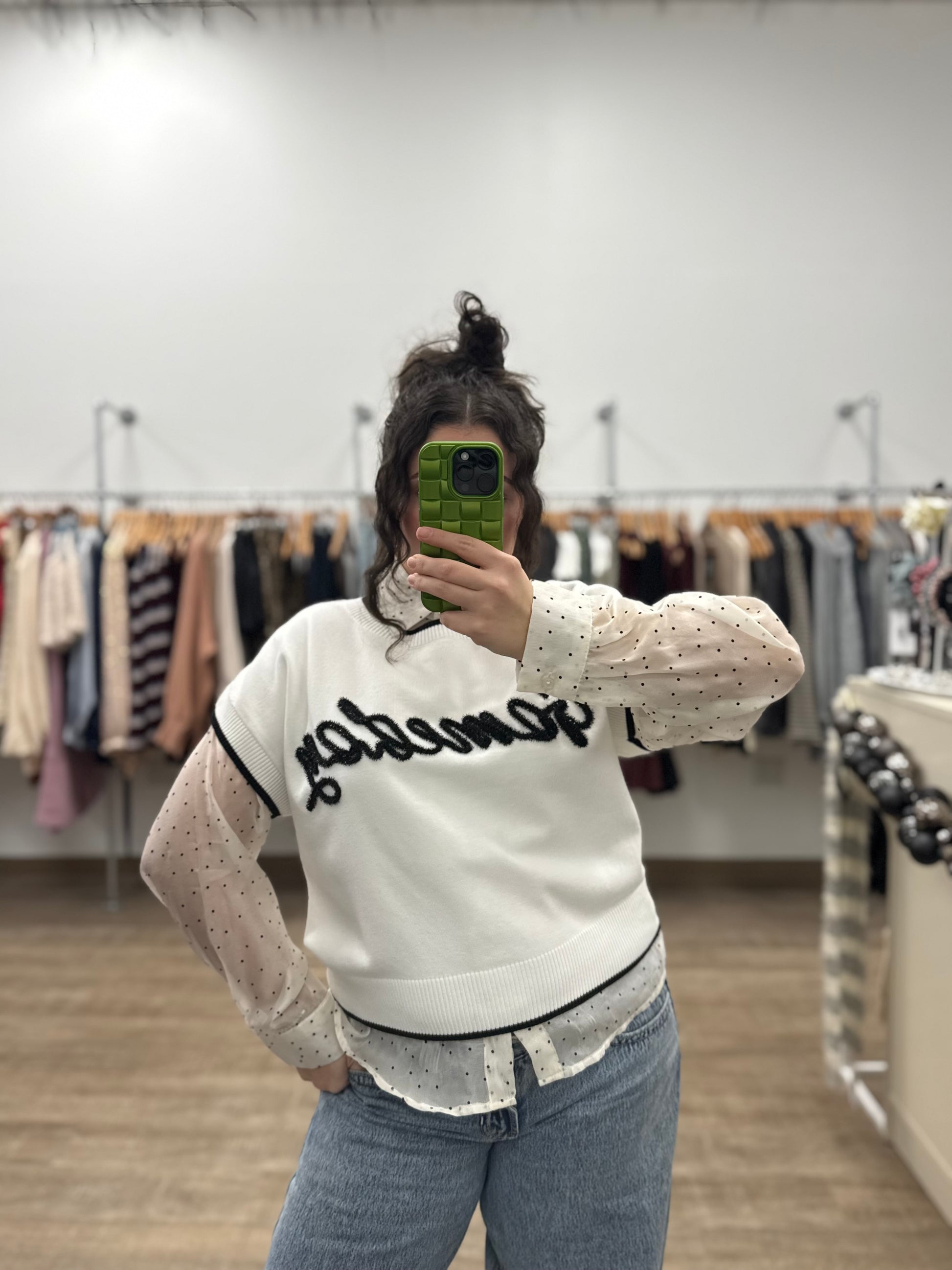 Gameday Short Sleeve Sweater, Tinsel Gameday Top,Short Sleeve Knit Top, Contrast Trim Sweater, Women's Gameday Apparel, White and Black Gameday Sweater, Graphic Knit Top, Cheerleading Sweater, Festive Sweater Top, Short Sleeve Knitwear, Tinsel Lettering Sweater, Team Spirit Sweater