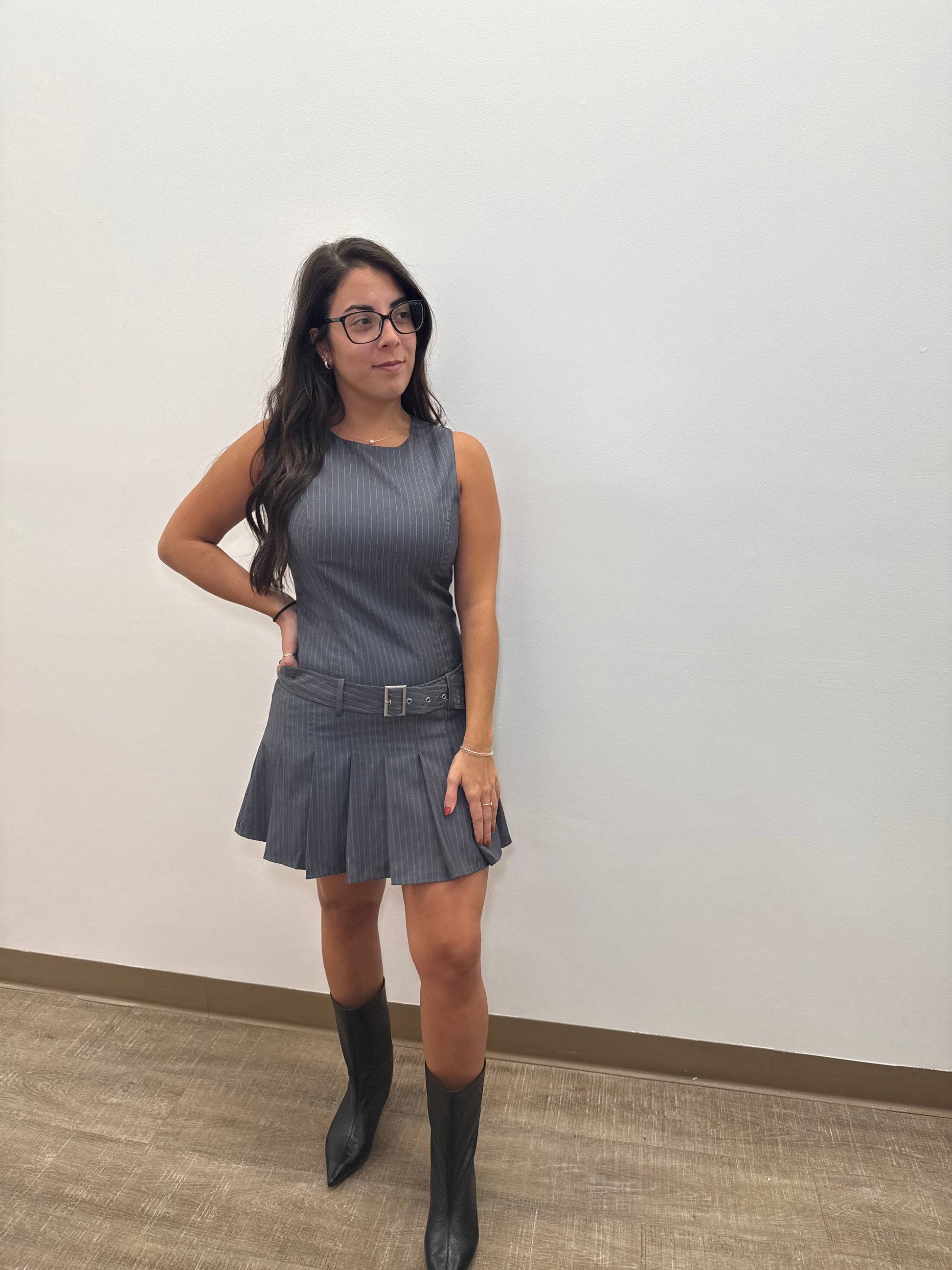 Pin Stripe Mini Dress, Drop Waist Mini Dress, Pleated Skirt Dress, Sleeveless Pin Stripe Dress, Tailored Mini Dress, Adjustable Belt Mini Dress, Back Zip Mini Dress, Pin Stripe Dress with Belt, Preppy Mini Dress, Drop Waist Pleated Dress, Sleeveless Work Dress, Woven Pin Stripe Dress