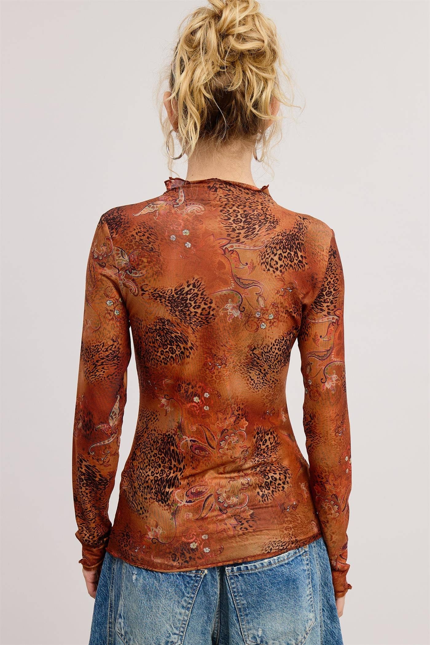 Mesh Mock Neck Top, Sheer Long Sleeve Top, Animal Print Mesh Top, Y2K Mesh Top, Lettuce Edge Top, Slim Fit Mesh Top, Layering Mesh Top, Watercolor Print Top, Floral Print Mesh Top, Stretchy Mock Neck, Y2K Floral Animal Print, Mock Turtleneck Mesh, Lightweight Sheer Top
